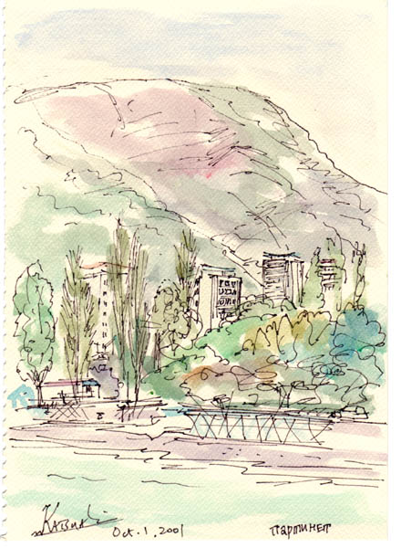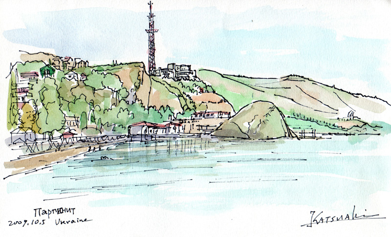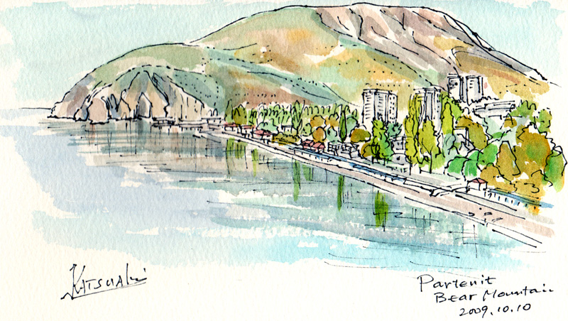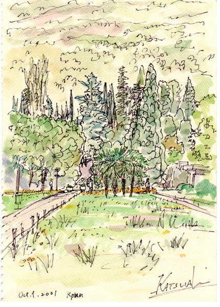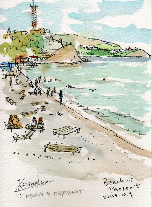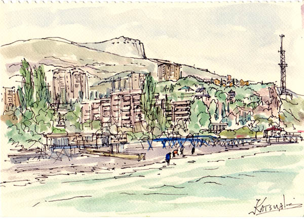 | Partenit | The health resort Krim from the 4th Corps, Flower beds and forest in the Krim resort , Beach of Partenit, Beach and Mt. Bear , Landscape in Krim from Room #45 , The lane along the beach in the morning |