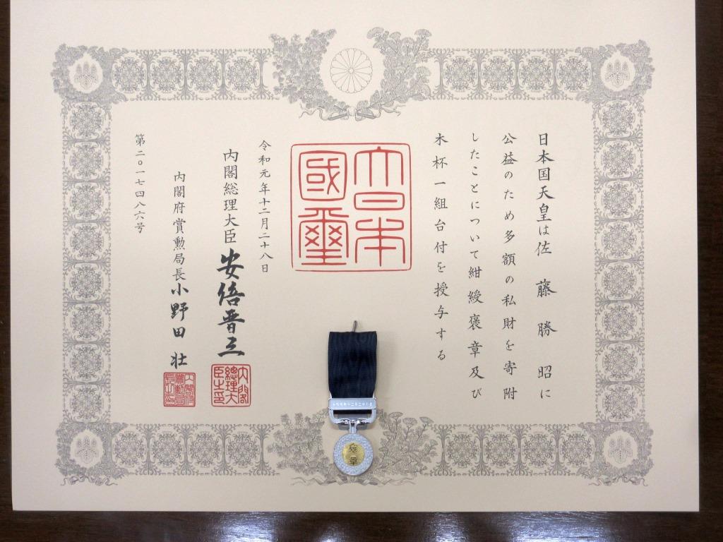 | 2019.12.28 | 日本国(Japan) | 佐藤勝昭 (Katsuaki Sato) | 紺綬褒章 (Medal with dark blue ribbon) | 東京農工大学への私財(絵画)の寄贈 (Donation of Paintings to TUAT) 伝達式(大野弘之学長から);2020.3.23 @東京農工大学 |
