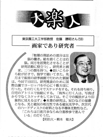 - 2001/03/05 毎日新聞(3/2夕刊、キャンパル)「画家であり研究者」として紹介された佐藤教官の記事を載せました。